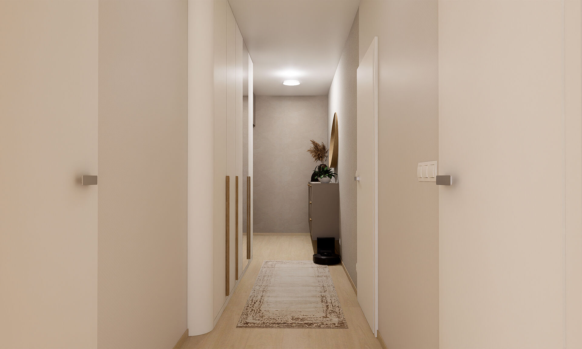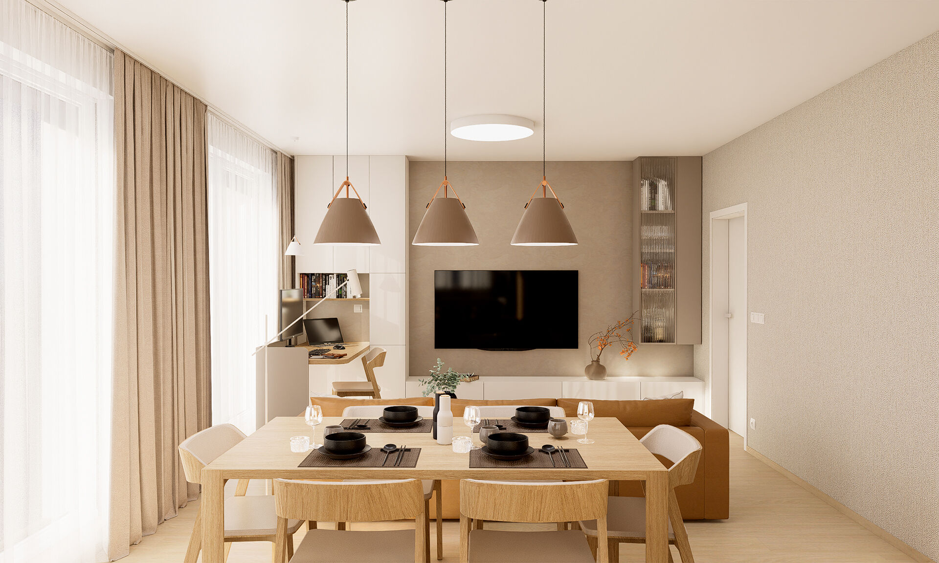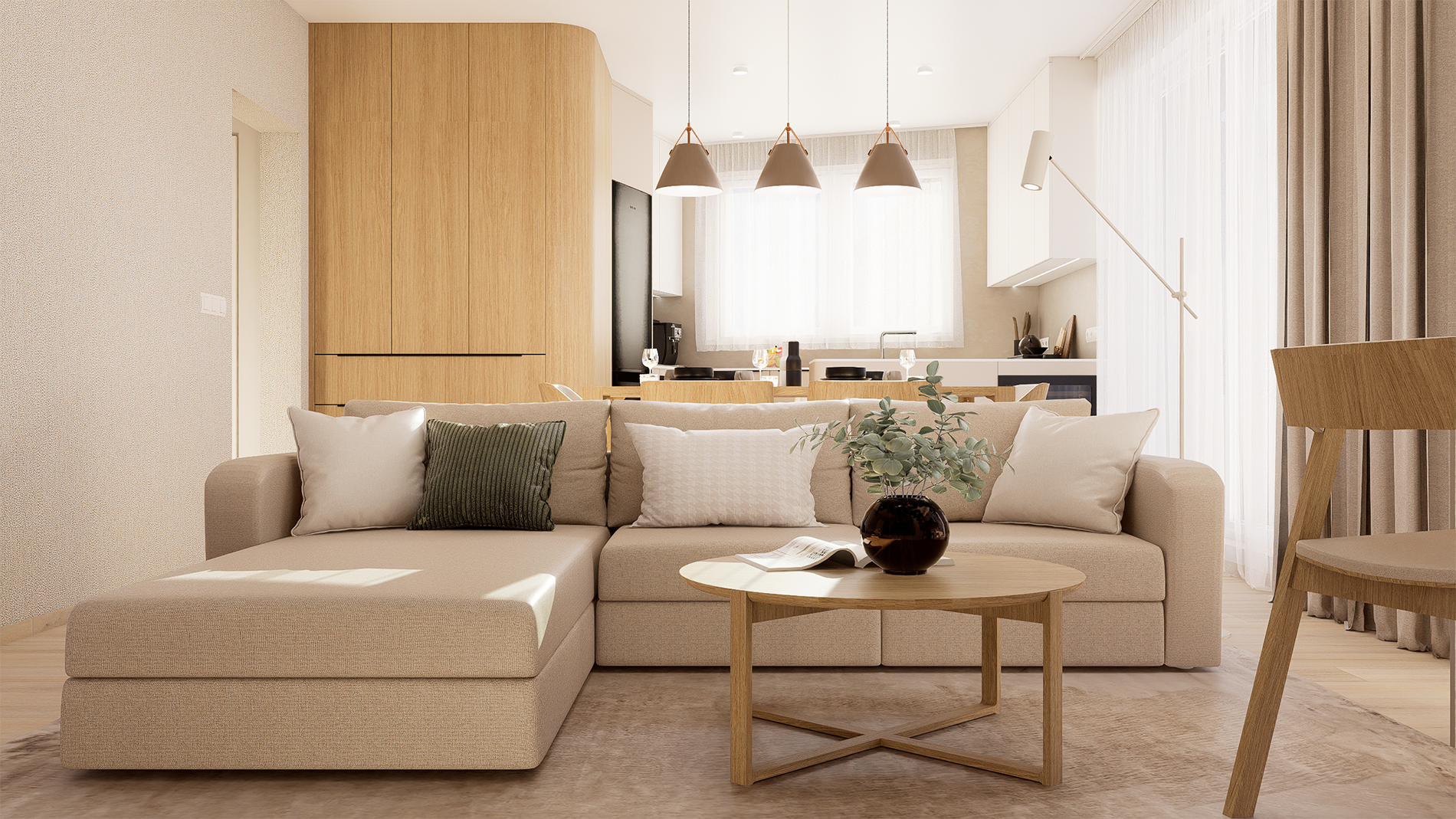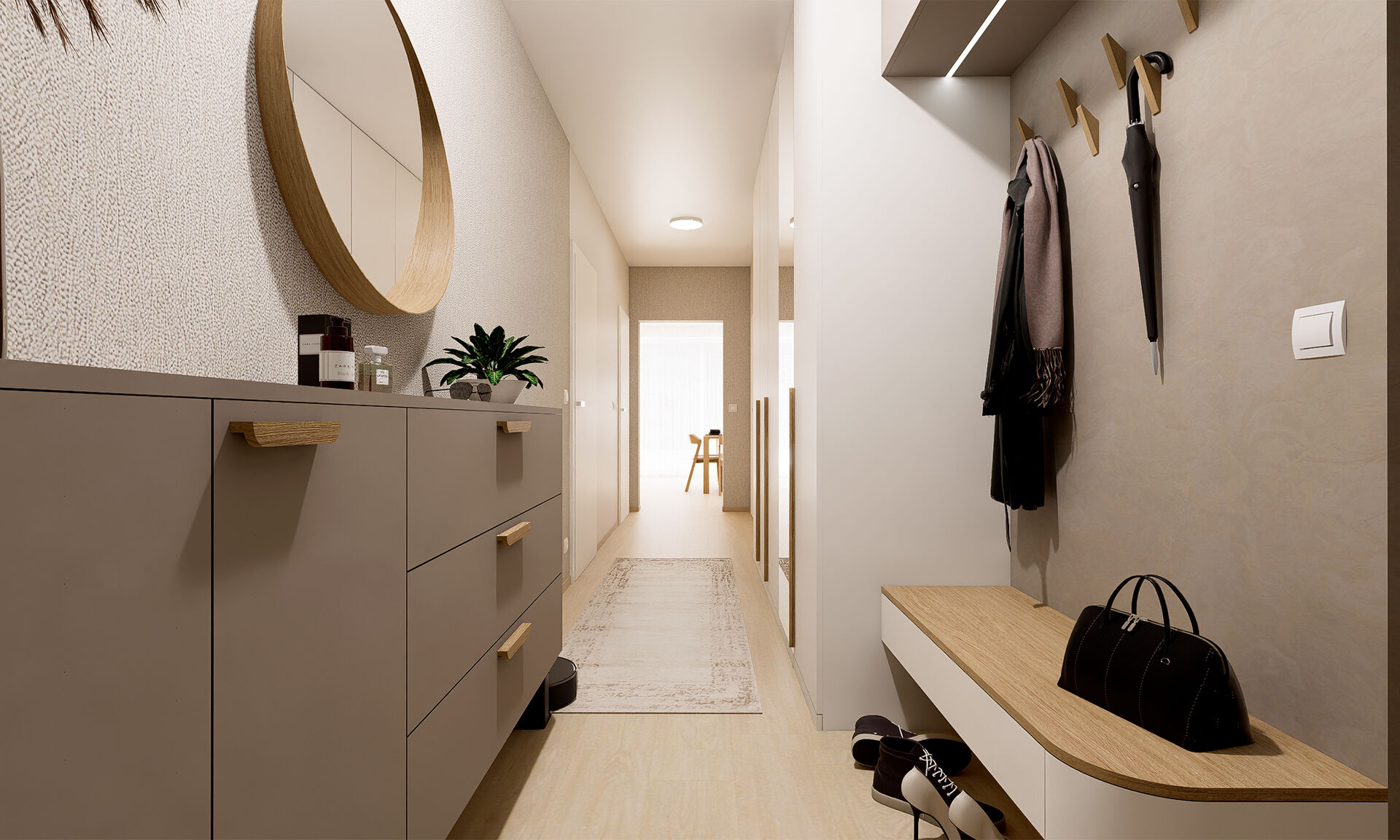 Návrh tohoto interiéru vznikl pro mladý manželský pár, který si přál vytvořit klidné a útulné bydlení s nadčasovým charakterem. Hlavním cílem bylo navodit pocit harmonie, tepla a přirozenosti, a zároveň zachovat vysokou míru praktičnosti pro každodenní život.