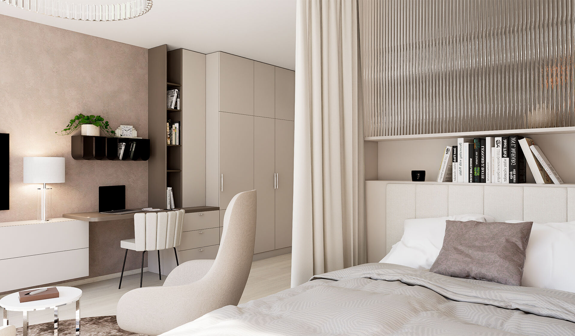 Součástí návrhu musel být také pracovní a kosmetický stolek – dvě zóny, které reflektují každodenní potřeby a zároveň podtrhují ženský charakter interiéru. Pracovní deska z umělého kamene byla zvolena nejen pro svůj elegantní vzhled, ale také pro svou praktičnost a udržitelnost.